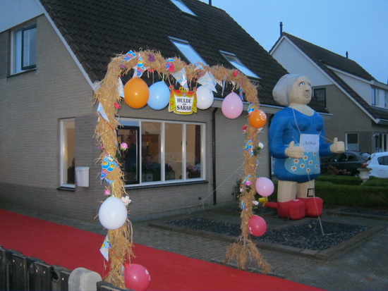 De jarige Joke wordt hier opvallend gehuldigd! Niet alleen een fikse Sarah in de voortuin, ook een erepoort bij de oprit! En nou nog maar zo’n portie (jaren) erbij, Joke! Gefeliciteerd!