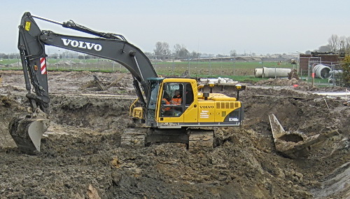 ‘Er is een foto van serie 11/11, daar is een foto waarop een gele kraan staat, waar die bak er bij ligt! Deze werd gebruikt voor de aanzet van de schuine wand van de tunnelkuip, beginnend vanaf de bovenkant en zo naar onderen. En zo worden de grote en brede sloten ook gemaakt.’