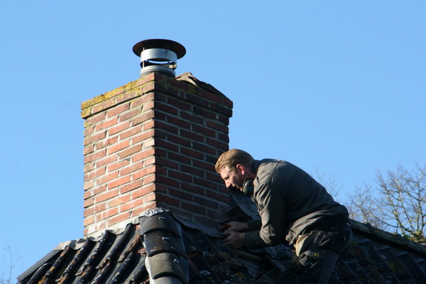 Op het dak van de woning van de familie Aptroot zit zoon Hielke het lood te bekijken. Lekkages verhelpen? In ieder geval zit hij in de novemberzon en voelt zich daarboven tamelijk op zijn gemak. Niks voor mij….