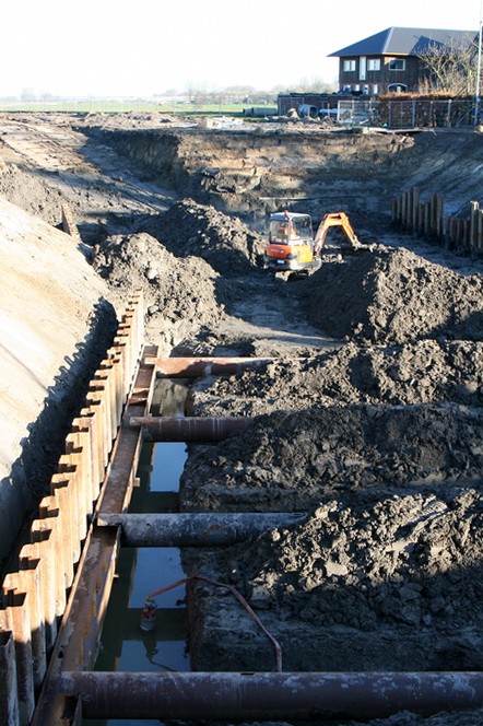 Hier de schaduwkant, want die is er ook… De zuidkant, de Wieringa-side. De resterende buizen moeten later achteraan worden gebruikt. Pas dan wordt de tunnelkuip verder uitgediept.