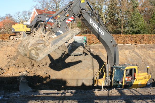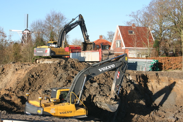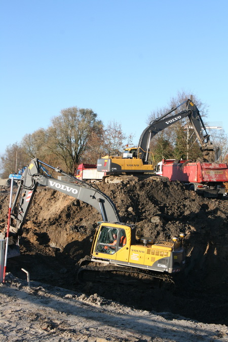 Gauw de omleidingsweg overgeglipt en de Volvo-specialisten aan het werk gezien! Hoe je ook over het project denkt, dit is machtig mooi om te zien! De voorste Volvo’er die de diepte zoekt; de achterste Volvo’er, op een troon, die de vrachtwagens vult. Vlot afvoeren… Waar gaat deze grond trouwens naar toe? Voor de nieuwe weg is er toch niks meer nodig? Of is er elders behoefte aan deze afgegraven grond?