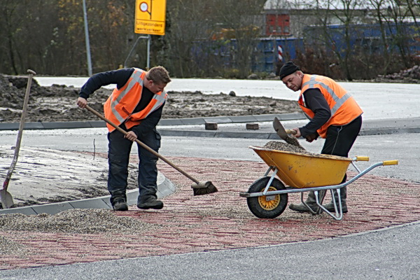 Dit zijn de kleine-steentjes-deskundigen van OosterhofHolman. Invegen op de rand van de rotonde en het overschot met behulp van een kruiwagen in veiligheid brengen….