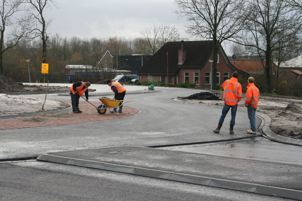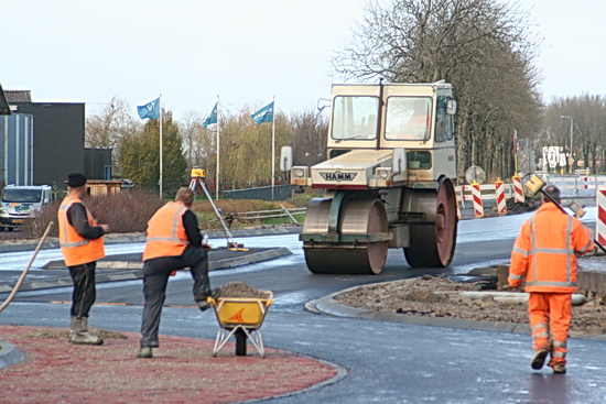 Doeners en praters, zo lijkt het. Maar praten betekent voor sommige werknemers ook doén! De rotonde heeft zijn deklaag al, het aansluitende stuk richting Grijpskerk wacht er nog op…