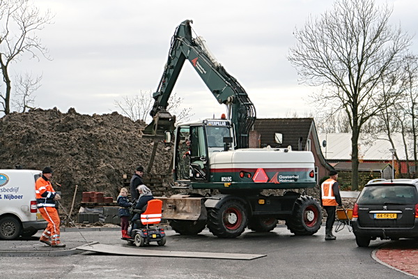 Prachtig die OH-grijper! Rotondebuurman Bert Hekkema praat met de machinist, zijn vrouw geeft de kleinkinderen uitleg. Links een werknemer die aan ‘rijplaten slepen’ doet, rechts de klein-grind-transporteur…. Of zijn het werknemers van het stratenmakersbedrijf?