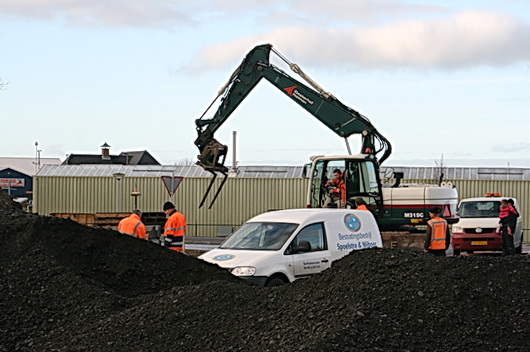 Achter de zwarte bulten mensen van twee bedrijven actief: OosterhofHolman en Spoelstra & Nijboer, voor de aanvullende bestrating.