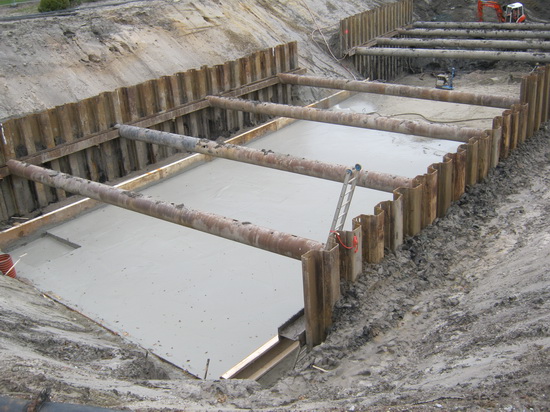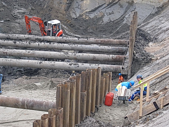 De gravers achteraan in de tunnelkuip oost zijn met de laatste fase bezig. De waterkelder krijgt zijn uiteindelijke vorm door de kleine graver; de Volvo vervolmaakt de oostelijke uitloop richting nieuw N355-tracé.