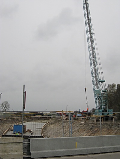 Zo ziet het er vanaf de zuidkant uit, als ik me nog snel, vlak voor twaalf uur, naar de werkzaamheden bij de tunnel en de rotonde begeef. Nog gauw enkele kiekjes voordat de Sinterklaasstorm me noopt binnen te blijven….