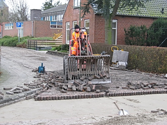 Aan de kop van de Oosterweg zijn twee stratenmakers van Oldenkamp met de laatste meters bezig. De jongste sleept de klinkers aan, met de kleine shovel. De oudste doet het ‘legwerk’… (Zijn maat is deze vrijdag afwezig).