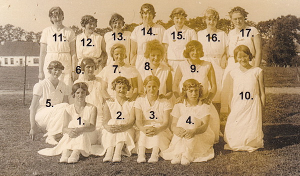 Achterste rij: Trien vd Noord, Ienje Kooi, Griet Hoogstra, Nella vd Noord, Rika Hekkema, Klaaske vd Noord en Tine Buining; middelste rij: Geertje van Hoogen, Ietje Duisterwinkel, Fenje Linstra, Lutske Veenstra, Aukje Jonkman en Lutske Hiemstra; voorste rij: Anneke Hekkema, Pietje Hiemstra, Wietske Linstra en Trijn Dijkstra…