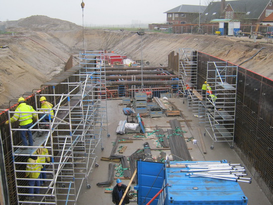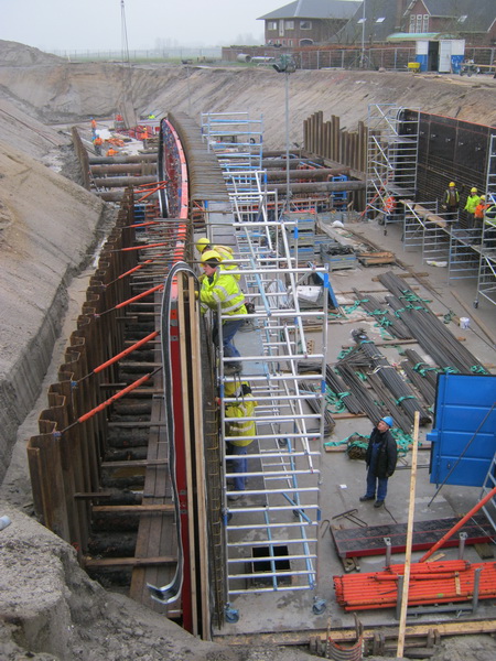 Totaalplaatje van de tunnelkuip oost, vanaf de westkant. Links en rechts de vlechters bij de bekistingswanden. Op de achtergrond, waar de steunbuizen nog zitten, het keldergedeelte. Daarachter het gedeelte van de tunnel dat niet wordt overdekt… (Of heb ik het mis?)