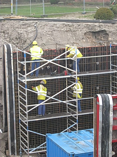 Beeld vanaf de westkant. De vlechters op twee verschillende hoogtes, de “aanjager” beneden op de kuipbodem….. Als dit vlechtwerk klaar is, wordt daar dus een andere bekistingswand tegen aan gezet, neem ik aan. En dan volstorten met beton….