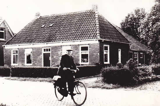 Hier komt de verwijderde kastanje dus vandaan. Het huis waarin het gezin van Klaas de Vries senior woonde, aan de Moeshorn. De opa van Hanna en Klaas fietst hier zelf op de voorgrond. De Vries woonde rechts, de familie Bakker heeft in het linker deel gewoond. (Zie ook het interview met Hilly Bakker enige tijd geleden…) De jonge kastanje stond dus rechts bij de boenplank. Hij is daar door de jonge Hanna eind jaren vijftig uitgegraven en meegenomen naar de Noorderweg, daar herplant.