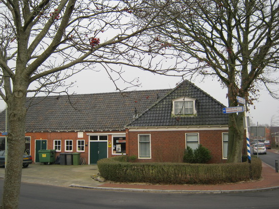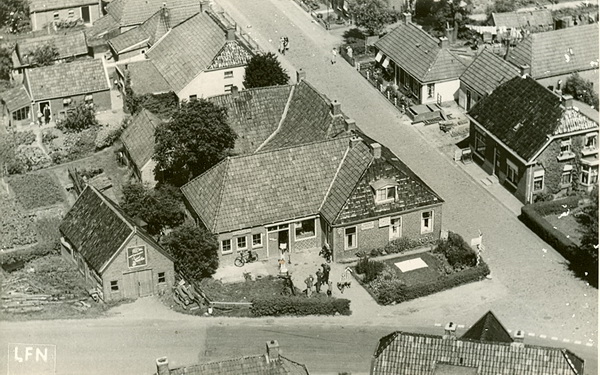 Heel oude luchtfoto van meer dan 62 jaar geleden…. Hier heeft Hanna de jonge kastanje nog niet geplant! En de eik staat er ook nog niet! Links de schuur van de wagenmakerij van Schuitema. De stammetjes die erbij liggen zijn dus andere dan die van de gekapte kastanje…. Later verkocht Schuitema land + opstallen aan Sijtze de Vries die hier de uitbreiding van zijn zaak met een showroom realiseerde.