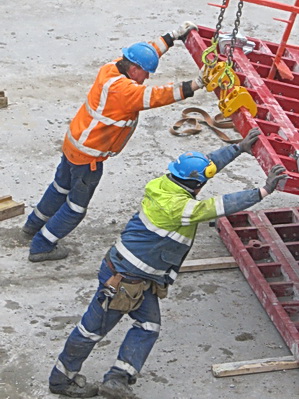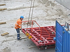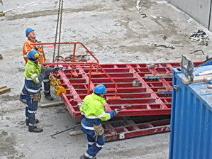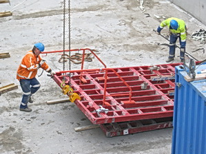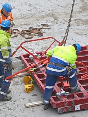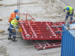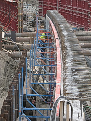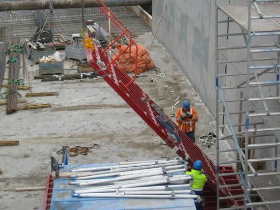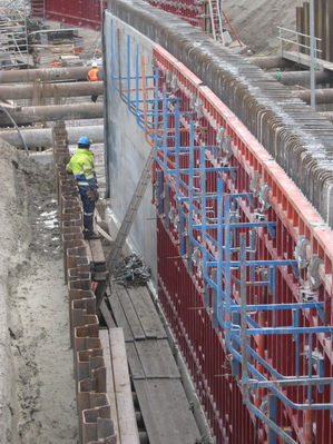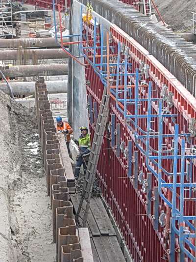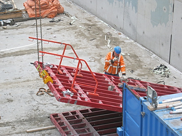 Terug bij de tunnelkuip aan de oostkant, net op tijd om te zien hoe een bekistingspaneel van de muur wordt ‘afgeplukt’….
