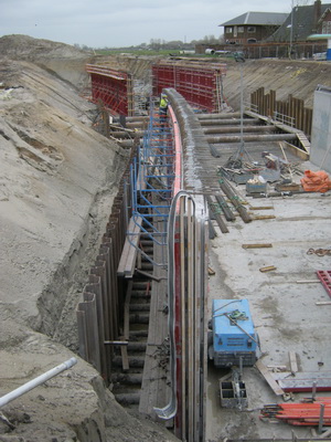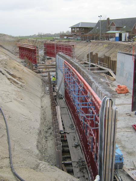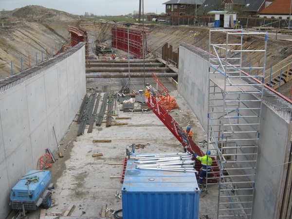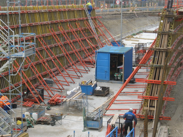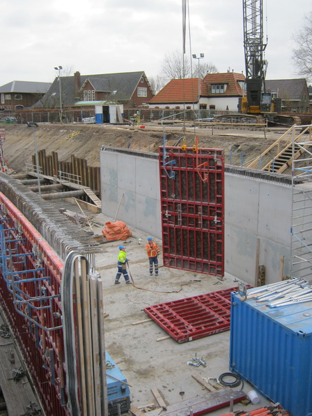 Maandag worden de wanden aan de oostzijde van de tunnelbak gestort. Dinsdag worden de wanden aan de westkant gestort. Er zijn dus maandag en dinsdag veel vrachtwagens (“betonmixers”) in Noordhorn te spotten. Tijdens het storten van beton zitten de timmermannen overigens niet stil. Zij bereiden elders het vlechtwerk voor en brengen ijzerwerk aan.