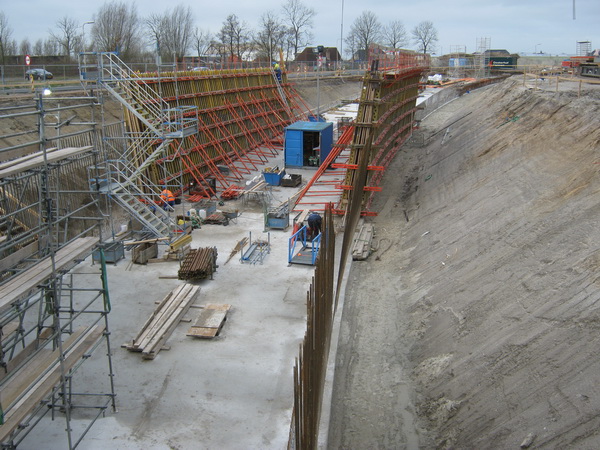 Voor het plaatsen van de ankers van de pijler aan de zuidzijde wordt een stalen scherm aangebracht. De ankers zorgen ervoor dat de damwand niet bezwijkt. Zodra het grondwerk klaar is wordt de hei-installatie aangevoerd om de palen van het landhoofd te heien. Aan de noordzijde worden de heipalen aangebracht. De betontimmermannen plaatsen volgende week de bekisting. De ijzervlechters brengen het stalen vlechtwerk voor het betonstorten aan.