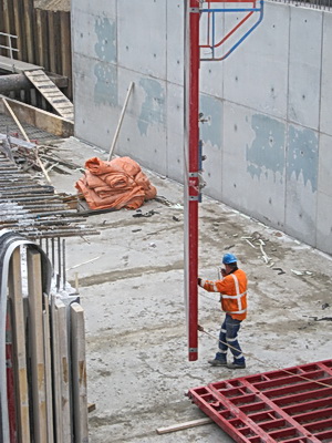 Als ik donderdagmorgen bij de tunnelkuip oost een kijkje neem, en flink wat kiekjes met de lutje Canon, wordt er gewerkt aan de “ontkisting” van de muren in segment 4, de buitenkant. De panelen aan de binnenkanten zijn al weer gebruikt voor de muren verderop.