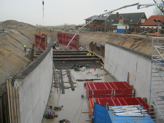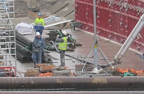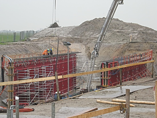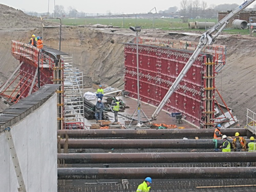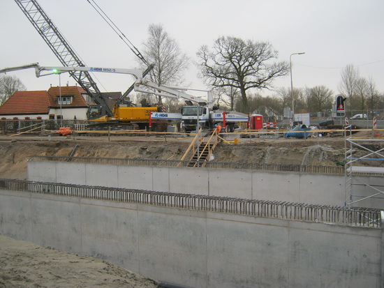 De hoop op een zonnige maandag 10 februari werd gaandeweg de ochtend de bodem ingeslagen. Toenemende grijsheid en een vervelende druppelregen…. Voldoende reden om de grote Canon thuis te laten en de lutje het vuile werk te laten doen….. Maandag – betonstortdag, aangekondigd in het provinciale weekbericht van Yvonne Arnst, op naar de oostkant van de tunnel, compartiment, of segment, of deel 2: