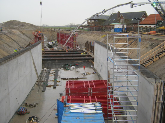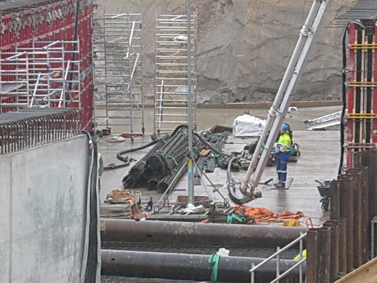 Het eerste beeld van deze nieuwe tunnelbouwweek….. Twee grijze muren met bovenaan gebogen staaldraad. Even flitste de gedachte aan gevangenismuren door me heen…. Op de achtergrond dichtbij de super kraan de betonpomp van Faber, gevoed vanuit een Kijlstra-betonauto. Dit nieuwe beton legt wel een lange weg af, zo te zien….