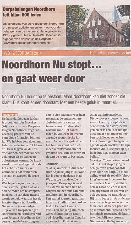 Het kan verkeren…. Eind vorig jaar had ik er een hard hoofd in, maar nu gloort het aan de horizon (dankzij vooral doorzetter Klaas de Vries!): Een herstart van het populaire Noordhorn Nu! Niet meer als maandelijks orgaan van de handelsvereniging “Fortuna”, maar volledig onder de paraplu van Vereniging Dorpsbelangen Noordhorn. Financiering? Op basis van advertentiebijdragen. En de advertentieverkoop is verheugend positief, dat schept vertrouwen. Ja, ik had al afscheid genomen van mijn vertrouwde rubrieken: Noordhorn Toen, Nijver Noordhorn Nu, Noordhorners…Toen, het interview…. Maar als een blad als “Noordhorn Nu” zoveel betekent voor Noordhorners en oud-Noordhorners en je kunt daar een steentje aan bijdragen…. (En ik vind het nog leuk ook!)