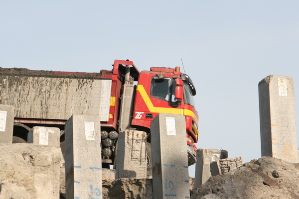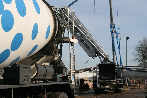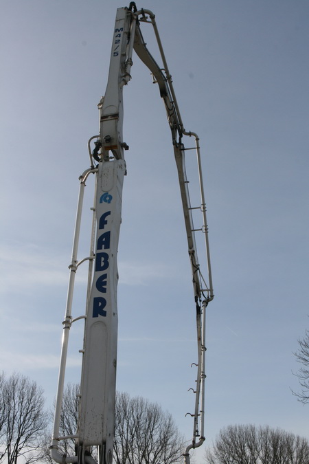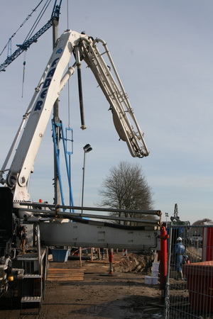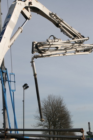 FABER is zo ver, de arm van de betonpomp kan ver reiken, naar de plaats van de pijler. Daar moet op een niet al te grote oppervlakte beton worden gestort. Een dikke laag, iets van 150 kuub (of heb ik het weer eens verkeerd verstaan???!)
