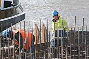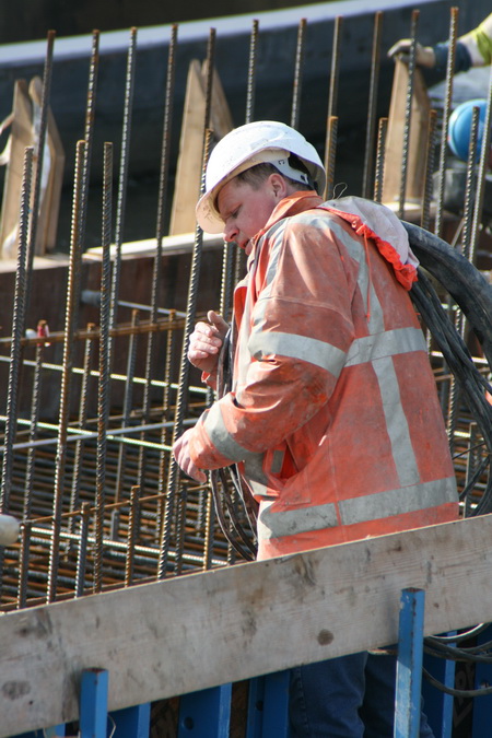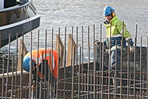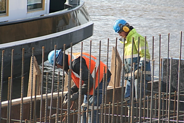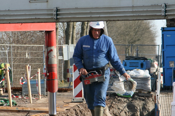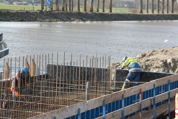 Hier aan de waterkant is de plek van de noordelijke pijler, een belangrijk steunpunt van de nieuwe, vaste, hoge brug. Zo te zien komt het beton storten nog niet iedereen gelegen…