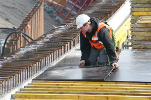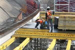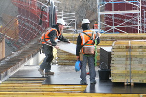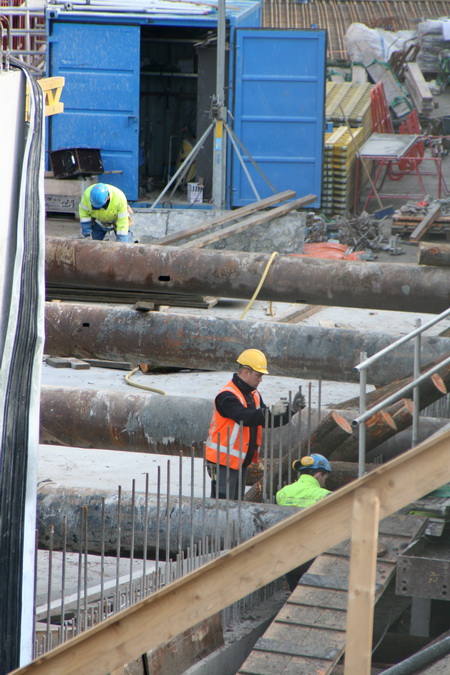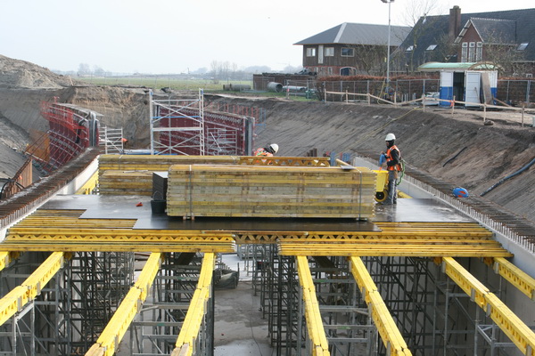 De overzichtsfoto van de tunnelkuip aan de oostkant, moten 1 t/m 4. Moot 4 op de voorgrond, het gedeelte waarover een dak wordt geconstrueerd met behulp van gele bekistingsbalken en donkere, gladde platen. (Inmiddels is de voorkant al helemaal dicht!)