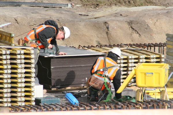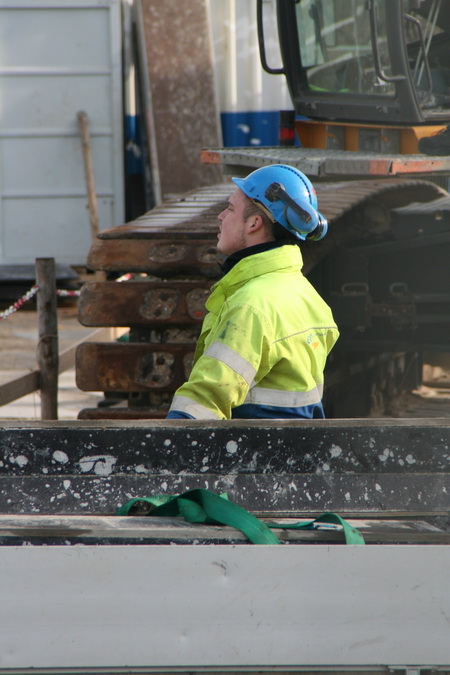 Bewerking ter plekke, gereedschap bij de hand. De groene veiligheidsband is hier duidelijk zichtbaar…