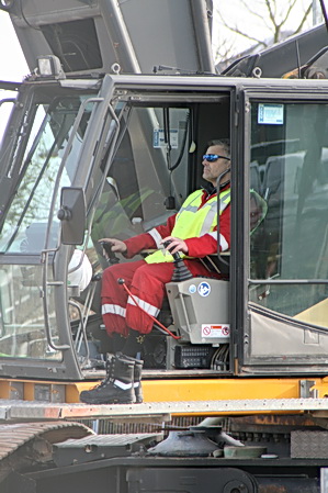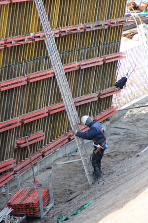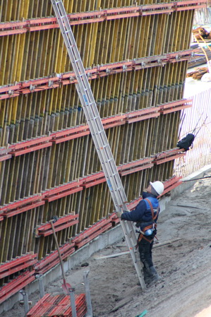 Dit is de vaak alleen werkende technicus bij de schuine wand verderop, moot 7, als ik goed tel… Het valt nog niet mee op die plek de ladder stabiel te plaatsen.