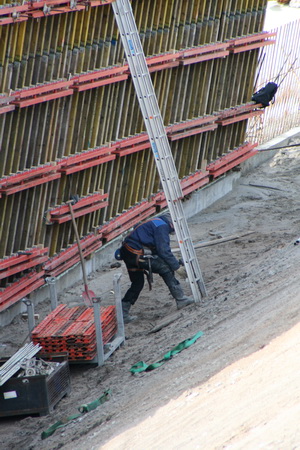 Maandag 17 februari waren de forse steunbuizen nog aanwezig, maar de vervangende boomstammen liggen al klaar. En er is al met de wapening van de wand begonnen, de bekisting wordt nog aangebracht….