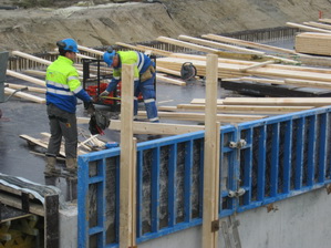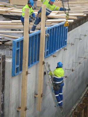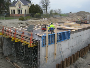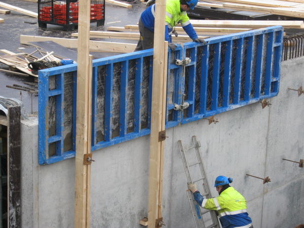 De bekistingspanelen worden gemonteerd tegen de muur aan de zuidkant.