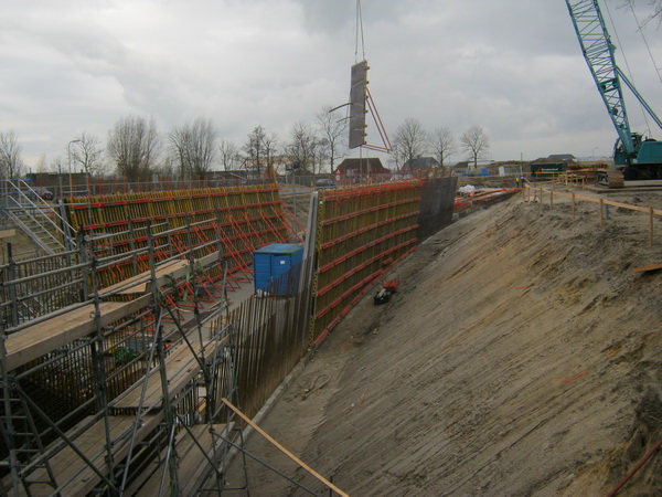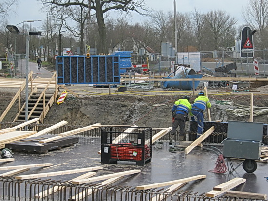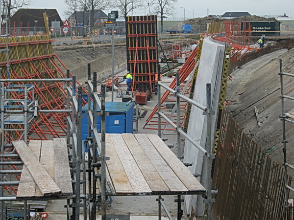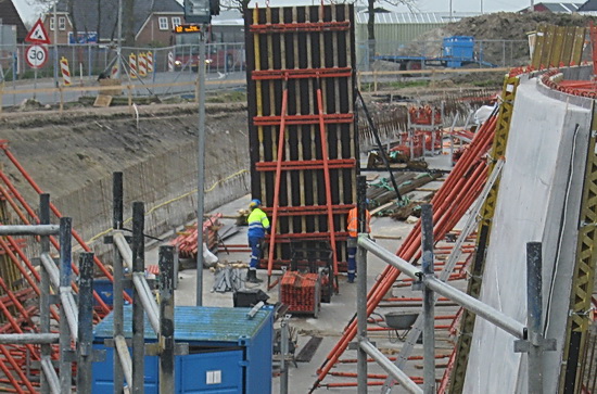 Vooraan, bij moot 6 aan de westwand, werken vlechters aan de wapening. Deze rechte wanden moeten na wapening nog deels worden bekist en dan kunnen ook hier de Kijlstra-auto’s verschijnen….