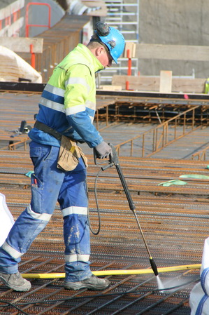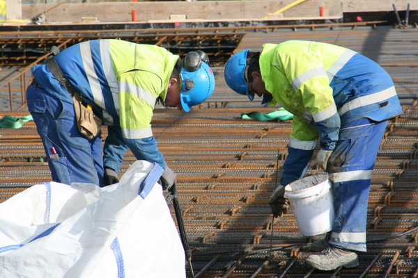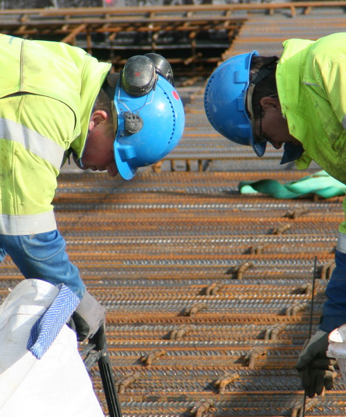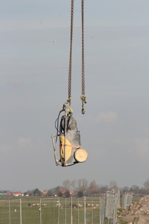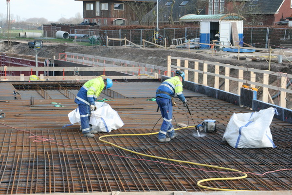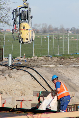 Het is betrekkelijk rustig op en bij moot 4. De totale vlechtploeg is nog aan het pauzeren. Hier zijn enkele GMB’ers met voor mij niet al te duidelijke wapeningsbezweringsbezigheden bezig, met peilstok en waterspuit.