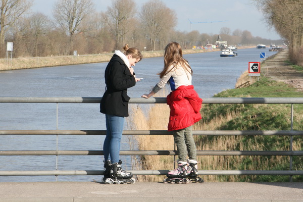 Even een brievenbus blij gemaakt aan de zuidkant van de brug en deze rollende jongedames ‘betrapt’ op een ‘smartphonebreak’….. (Is dit nou skeeleren of skaten?)