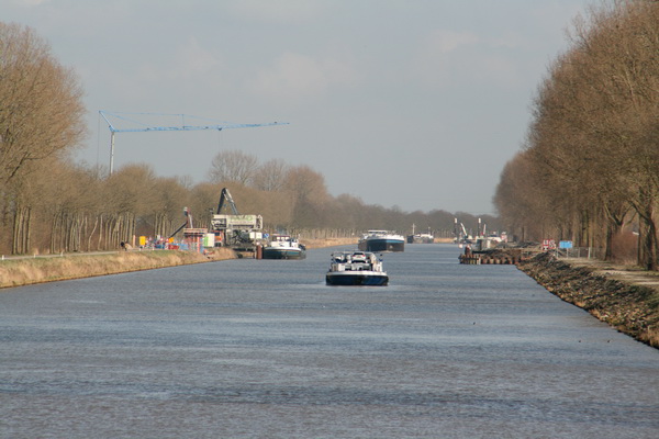 In de verte richting Aduard veel scheepvaart op het Van Starkenborghkanaal nabij de bouwput van de NVH-brug…