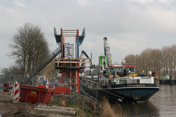 Centraal het kunstwerk dat is opgetrokken voor de noordelijke brugpijler. De bekisting is al een heel eind gevorderd. Volgende week zal de wapening worden voltooid. En dan is er heel wat beton nodig voor deze toekomstige steunpilaar! Rechts de “Progress”, met kraan, zich opmakend voor het weekeinde….