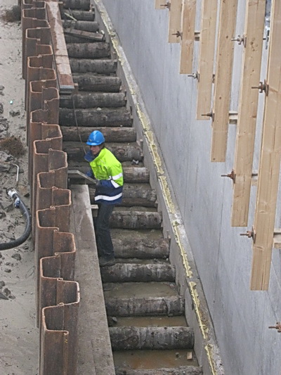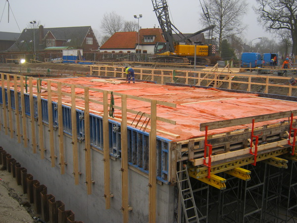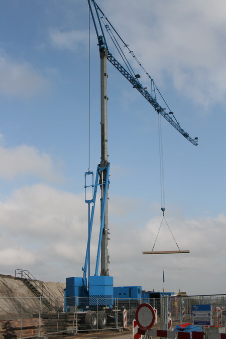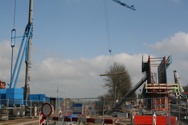 Wat een stellage! En er wordt nog steeds aan geknutseld! Van de ondergrond (heipalen waarvan de koppen zijn gesneld, waarna er is gewapend en beton gestort…) zie je weinig meer….