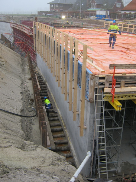 Op het dak van de tunnel ‘slechts’ één GMB-plankensjouwer, hij neemt de honneurs waar…. Een dag eerder is er beton gestort (merk Kijlstra, Fries beton, hoop dat het zich goed houdt hier in het Groninger land….), foto’s ervan heb ik niet door verkeerde informatie vanuit de wandelgangen. (Kan eens gebeuren…) Foto’s zijn er wel bij Jan Thijs de Haan: www.janthijs.blogspot.nl