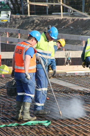 Alvorens er beton wordt gestort, dient de bekistingvloer geheel schoon gemaakt te worden van alles wat er op is komen te vallen…. Duizend stukjes vlechtdraad, stukje hout, peuken spijkers, enz, enz. Het stokje met het oranje bolletje schat ik in als een magneet. En de waterlans spuit alles één kant op naar waarschijnlijk spoelluikjes waar door alles verdwijnt.