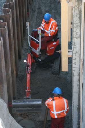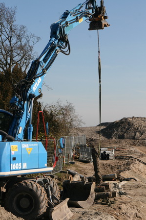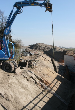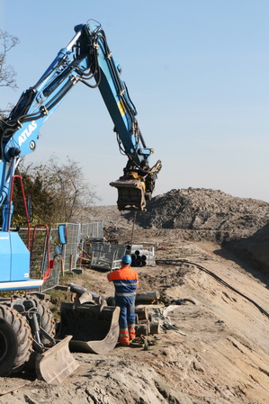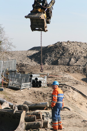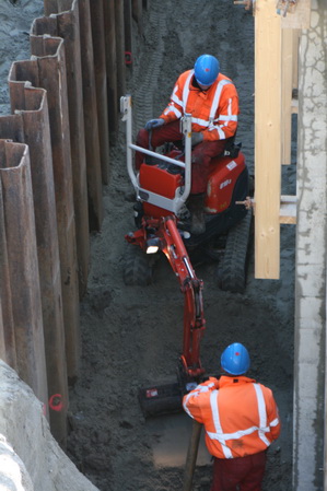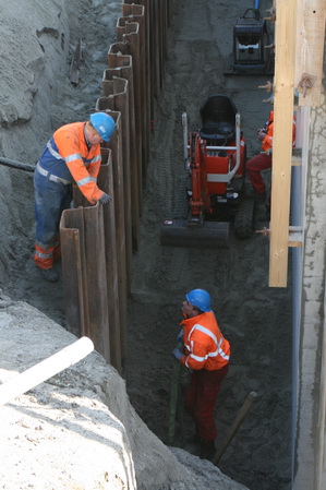 In de nauwe ruimte naast moot 4 gaan de betrokkenen verder met het “aanstampen”. Uiteindelijk moet de steunfunctie van de boomstammetjes (en later de metalen platen) worden overgenomen, instortingen of andere grondverschuivingen zijn niet gewenst!