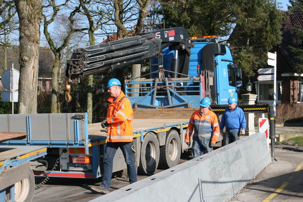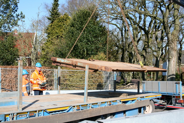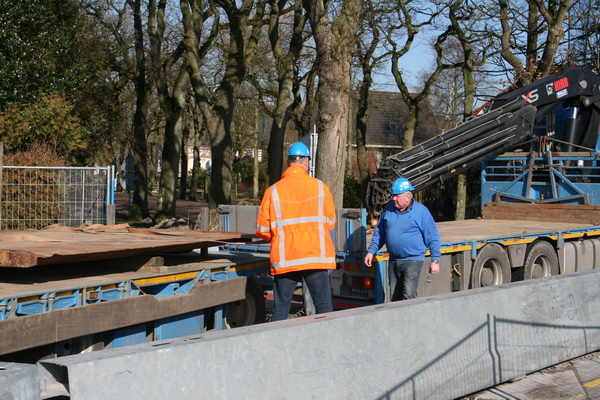 Een lange vrachtwagencombinatie van GMB komt de afslag naar het dorp korte tijd versperren, maar met dit mooie weer is er niemand die moppert of zit te drammen… Auto’s rijden desnoods om, fietsers kiezen eventueel voor de auto-uitrit…. Een grote, zware ijzeren plaat moet worden gelost.
