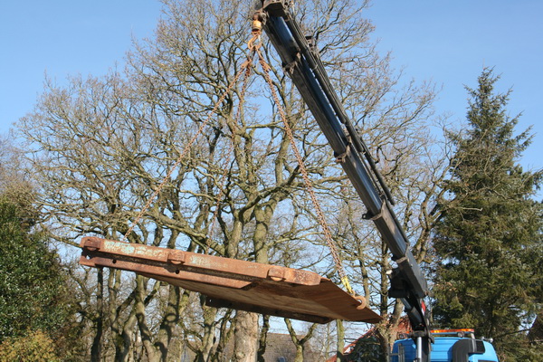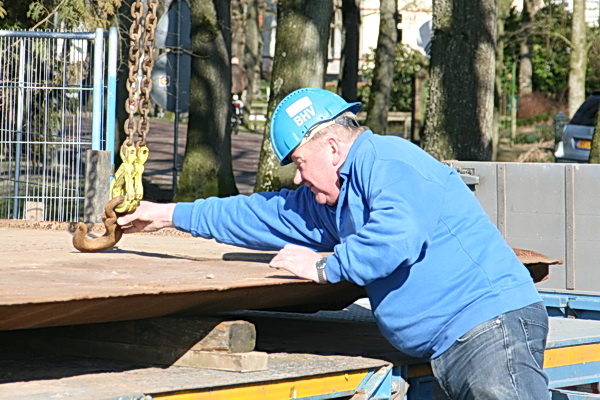 De blauwe kapitein zorgt aan de zuidkant voor het kundig bevestigen van de haken… Je bent tilspecialist of je bent het niet…
