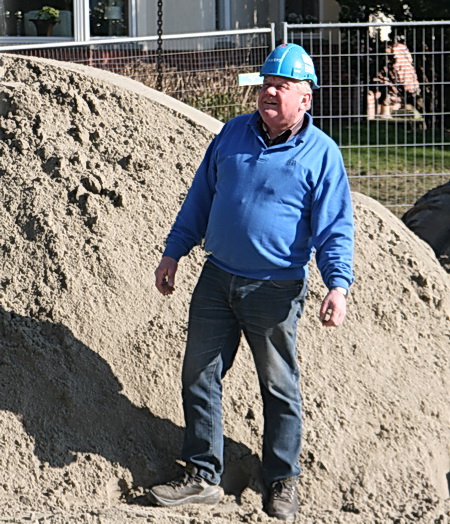 “De Staphorster” (benaming is van Jan Thijs de H.) is voortvarend ter plekke, vanuit de smalle ruimte beneden, om het steunstammetje te ontkoppelen. Kan de “blauwe kapitein” (om het woordgebruik van Jan Thijs te handhaven) een grote bak aanhaken, want er moet meer zand naar beneden. Er komen nog twee kiepauto’s met zand….