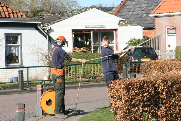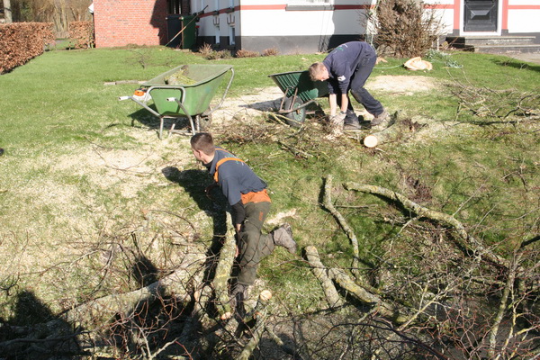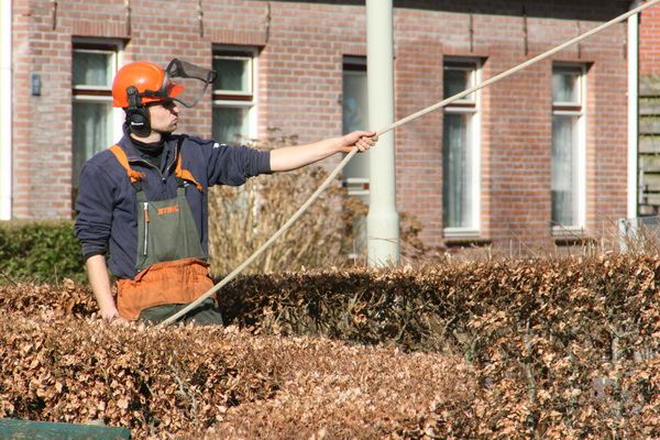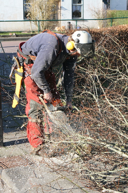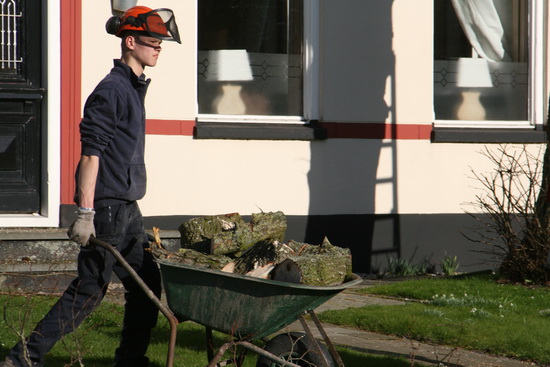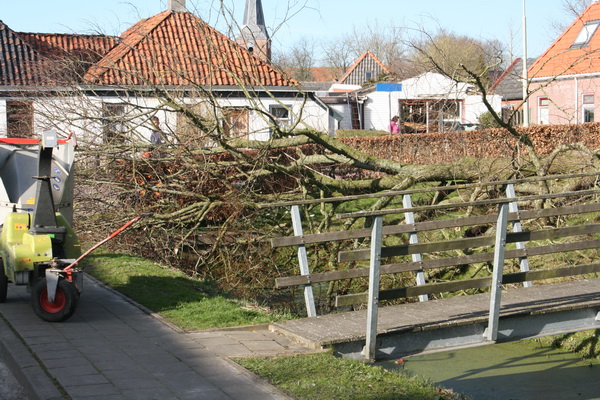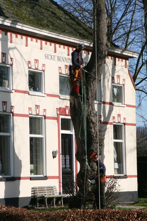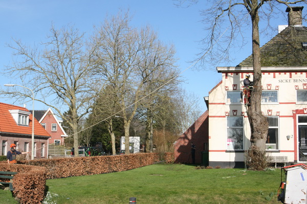 Jur Kok in de boom, helper aan het touw, een derde aan het opruimen… Voorkant Sicke Benninghestede, dinsdagmiddag 4 maart jongstleden….