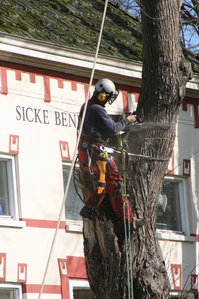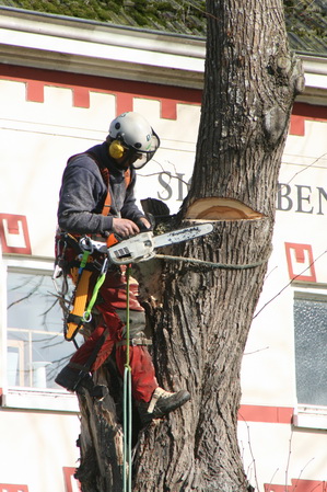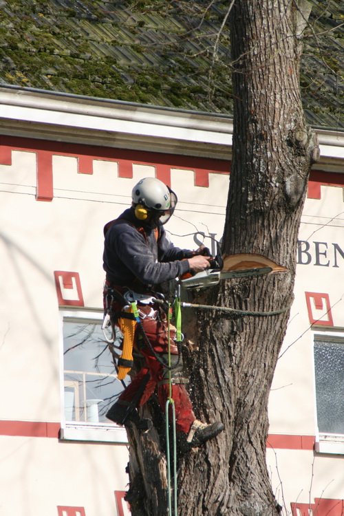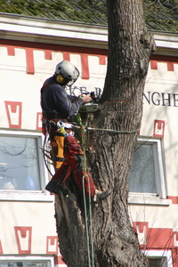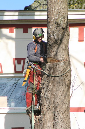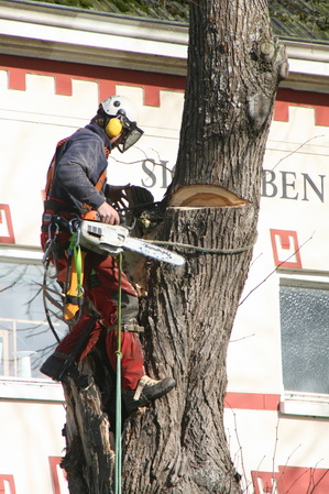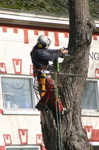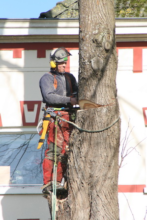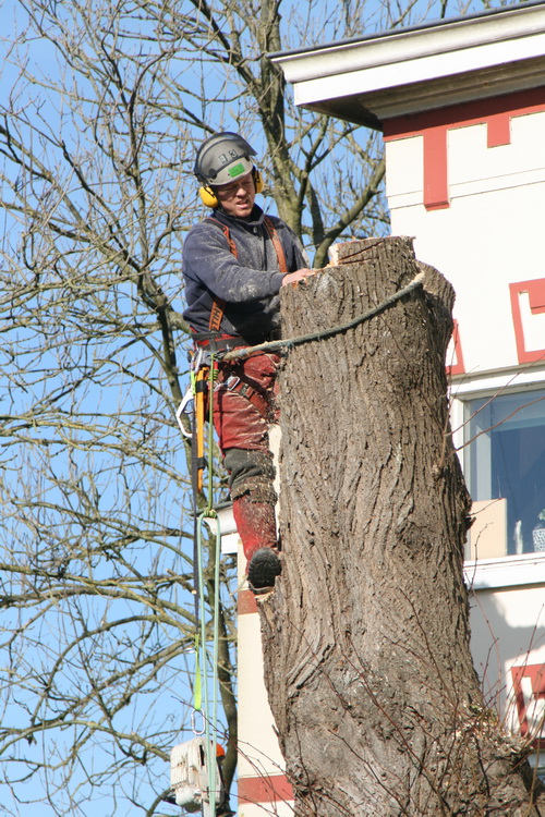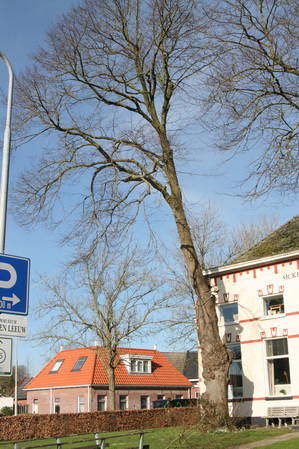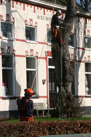 Gistermiddag (4 maart jongstleden) stuitte ik onverwacht op drie energieke medewerkers van hoveniersbedrijf Kok en Dekker. Ze waren bezig de oude loofboom aan de Oosterwegkant, getekend door stormschade (28-10-2013), een aantal kopjes kleiner te maken.
