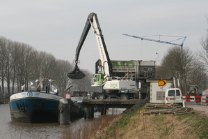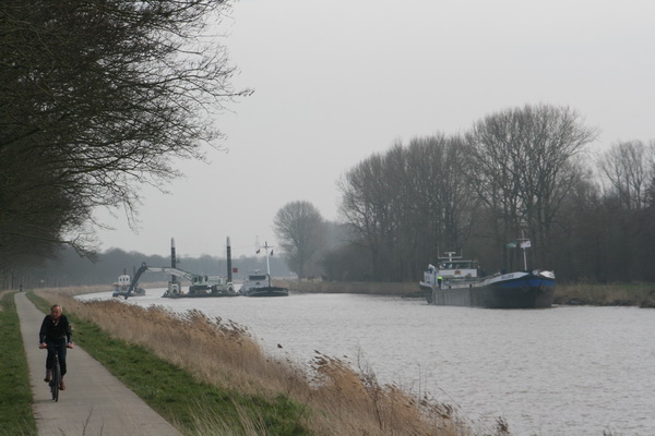 Het kanaal richting Aduard, een van de twee plaatsen waar nog steeds wordt gebaggerd. (De andere is aan de westkant van de spoorbrug). De “Con Zelo” is bijna gevuld, de “Nelleke” ligt geduldig op haar vulbeurt te wachten. De bagger kan nog steeds worden gebruikt bij de aanleg van het nieuwe N355-tracé. Het grondlichaam is onverzadigbaar…