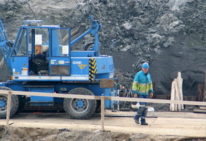 Het noordelijke grondlichaam met de kiepauto’s van Zwama en een drukdoende shovel. Het talud groeit nog steeds….