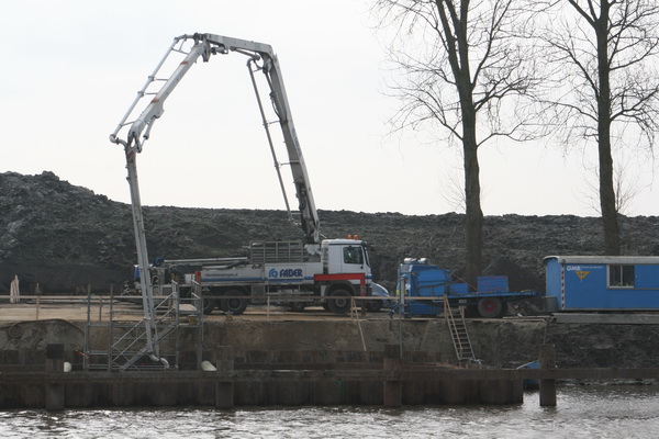 De Faber-betonpomp met zijn lange arm in de diepte van de damwandkuip, waarin de zuidelijke pijler “op staal wordt gefundeerd”… Voor die pijler is nog meer beton nodig dan voor de noordelijke… Alleen: Waar blijft het beton??! Geen Kijlstra te zien…