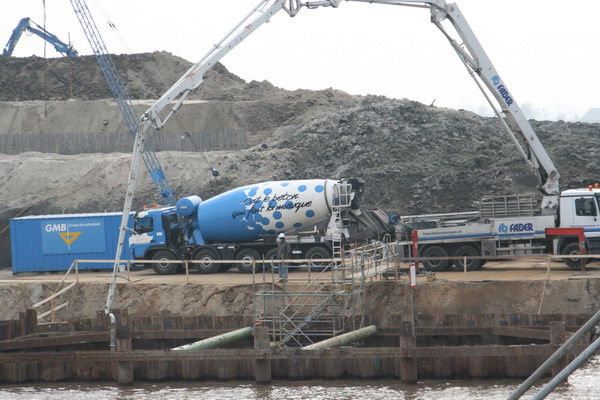 Op de voorgrond is aan de rand van het kanaal een damwandkuip geslagen. Daar wordt “gefundeerd op staal”, voor wat betreft de bouw van de zuidelijke pijler van de nieuwe brug. Hier dus geen heipalen…