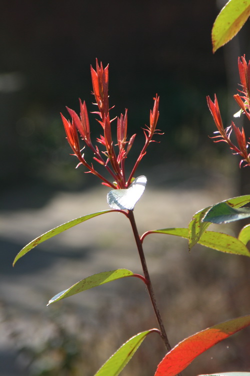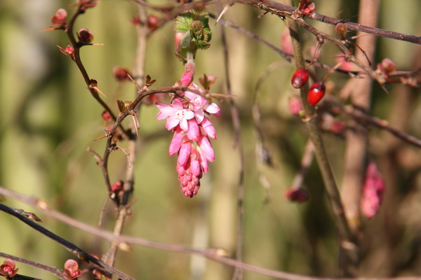 Voorjaar en herfst ontmoeten elkaar in het groen langs het paadje tussen Verlengde Oosterweg en Nieuwstraat. De besjes zijn een overblijfsel van de herfst, het bloempje van de ribes is een voorjaarsbode…
